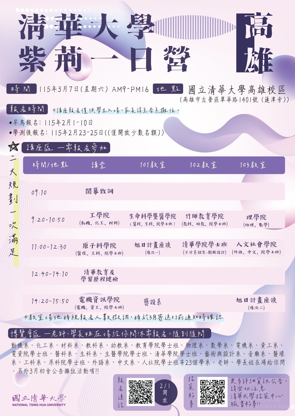 一、為利高中同學進行校系選擇時,得充分瞭解科系內涵,本校將於115年3月7日(星期六)於高雄校區【高雄市左營區翠華路1401號 (蓮池潭旁)】辦理紫荊一日營活動,規劃校系專題講座及博覽會活動,說明相關資訊如下: