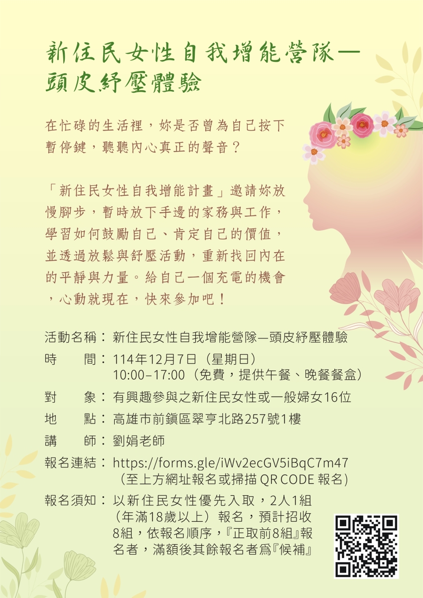主旨:本中心辦理「114年新住民女性自我增能計畫」,檢附活動海報,敬請協助宣傳周知,並鼓勵所屬踴躍報名參加,請查照。