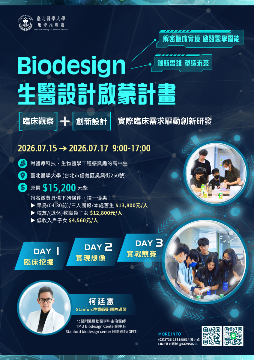 (四)Biodesign生醫設計–建立學員對 Biodesign 醫材開發之基礎認知與學習興趣,透過系統化引導,帶領學員實際體驗從「需求識別」到「解決方案設計」的完整歷程,進而培養其設計思維與問題解決能力。